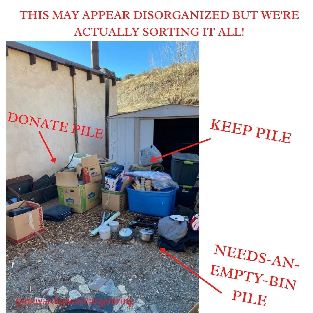 Channeling the method Mari Kondo uses, we took EVERYTHING out of the shed and sorted it into piles. We simultaneously weeded out items for donation, that belonged somewhere else, or that had become trash.